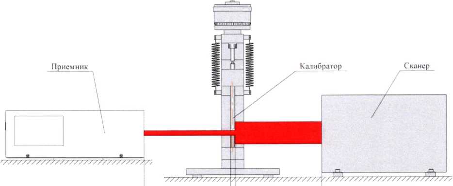 10.1.3. Установить измеритель и калибратор на горизонтальном основании, таким образом, чтобы линия развертки лазерного луча измерителя освещала вертикальную ось штоков калибратора. При этом, развертка луча должна полностью перекрываться по ширине штоками калибратора и/или метками. Центр линии развёртки лазерного луча должен находиться в горизонтальной плоскости, проходящей через середину расстояния между подвижным и неподвижным штоками, разведёнными до наибольшего предела измерений калибратора. При разведении штоков калибратора до наибольшего предела измерений на штоки калибратора с метками должен попадать свет лазерного луча. Контролировать правильность взаимного расположения измерителя и калибратора следует по форме и величине сигнала на приемнике в соответствии с требованиями раздела 2 руководства по эксплуатации на измеритель.