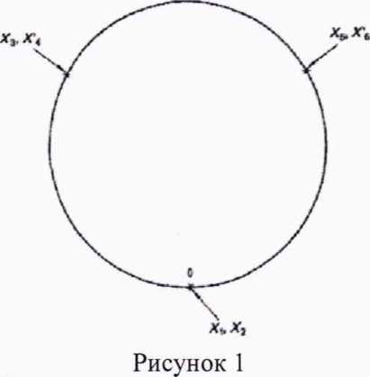 Затем нагружают и разгружают датчик двумя рядами силы с возрастающими и убывающими значениями в положениях с поворотом на 120° и 240° (рисунок 1) относительно первоначального положения. Регистрируют соответствующие показания датчика Х3, Х5 (при нагружении) и Х4, Х6 (при разгружении).