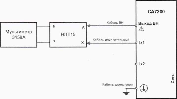 10.3 7 Соберите схему измерений, приведенную на рисунке 5. В качестве делителя напряжения используйте трансформатор напряжения НЛЛ с номинальным вторичным напряжением 100 В при номинальном первичном напряжении 1000 В