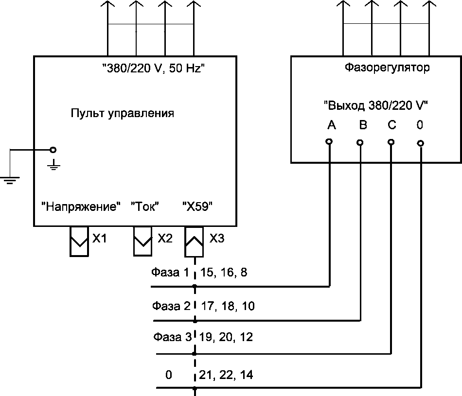 Выходная цепь фазорегулятора должна быть соединена “звездой”. Выходные фазные напряжения не должны превышать 242 V. В случае, если выходная цепь фазорегулятора соединена “треугольником”, возможно подключение его к установке через разделительные трансформаторы необходимой мощности для формирования четырехпроводной цепи. Фазные напряжения, подаваемые на разъем “Х59” пульта управления не должны превышать 242 V. Порядок чередования фаз должен быть прямым.