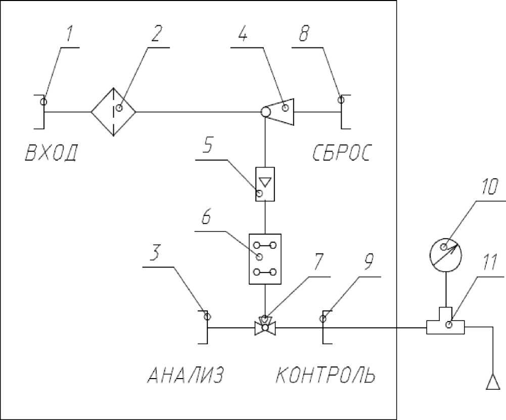 7) подключить баллон с ПГС,открыть вентиль на баллоне, подсоединить подводящую газ трубку к поверочному колпачку поз.9 (см. рисунок 12.2) или входу «Контроль» (см. рисунок 12.3) и включить секундомер. Не бо-