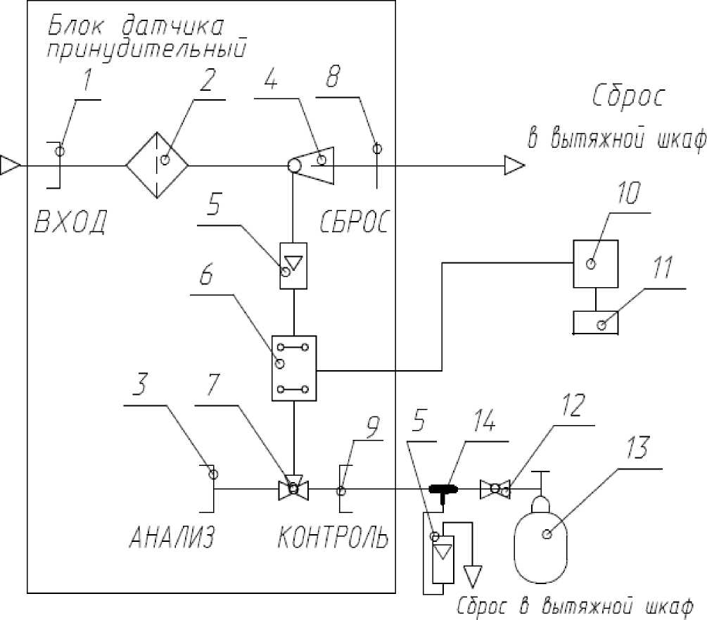 5) продуть датчик воздухом из баллона или из помещения (для сигнализаторов с принудительной подачей смеси), отсоединить подводящую газ трубку от поверочного колпачка поз.9 (см. рисунок 12.2) или входа «Контроль» (см. рисунок 12.3)