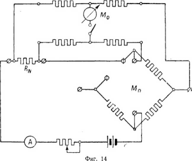 14. Принципиальная схема двойного моста приведена на фиг. 2. где Rn — сравнительное плечо, а парные сопротивления Ri и Rz, R’t и R'z — плечи отношения.