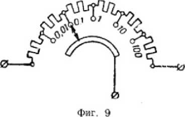 Плечи отношения в виде нескольких пар катушек со значениями сопротивления, равными 10* омов и включаемые при помощи двух штепселей, показаны на фиг. 7. Такие же плечи отношения, но с взаимозаменяемыми катушками сопротивления, изображены на фиг. 8. На фиг. 9 дана схема плеч отношения, выполняемых в виде одного общего сопротивления с отпайками, части которого при перемещении