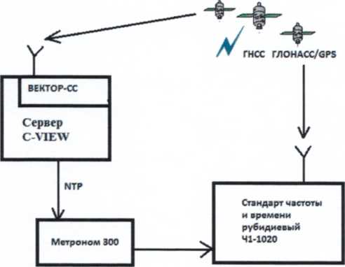 Вход 1PPS стандарта частоты и времени рубидиевого 41-1020 соединить с выходом 1PPS устройства синхронизации частоты и времени Метроном 300. Метроном 300 по протоколу NTP присоединяется к серверу C-VIEW.