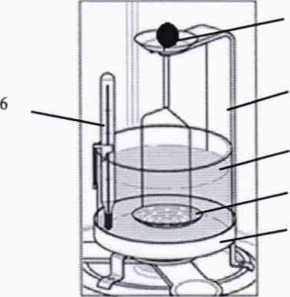 На рисунке Б.1 компаратор массы (весы) устанавливается на столик с отверстиехМ 3, так, чтобы поддонный крюк для подвески попал в отверстие. К поддонному крюку для подвески прикрепляется леска (проволока) 4, к которой в свою очередь крепится держатель 6. Леска (проволока) не должна касаться стенок отверстия столика 3. На столик 8 устанавливается емкость 7 и заливается вода так, чтобы она полностью и даже с запасом покрывала держатель. В емкость с водой помещают термометр для контроля температуры воды.