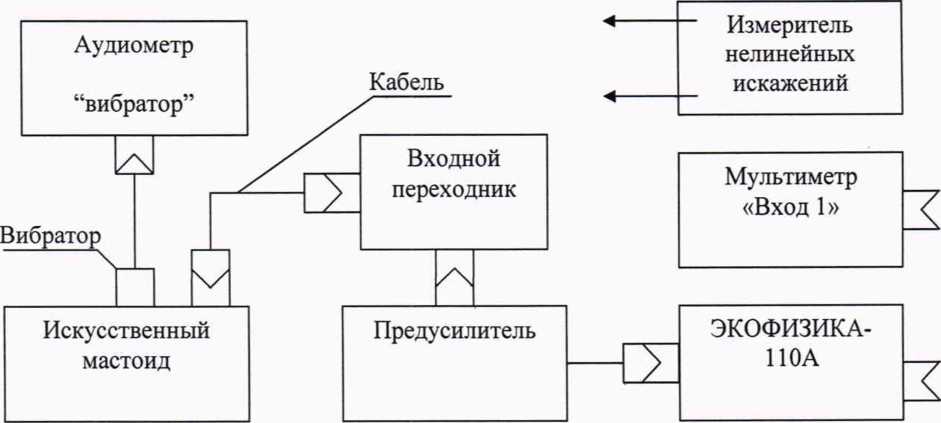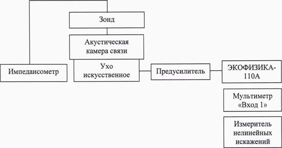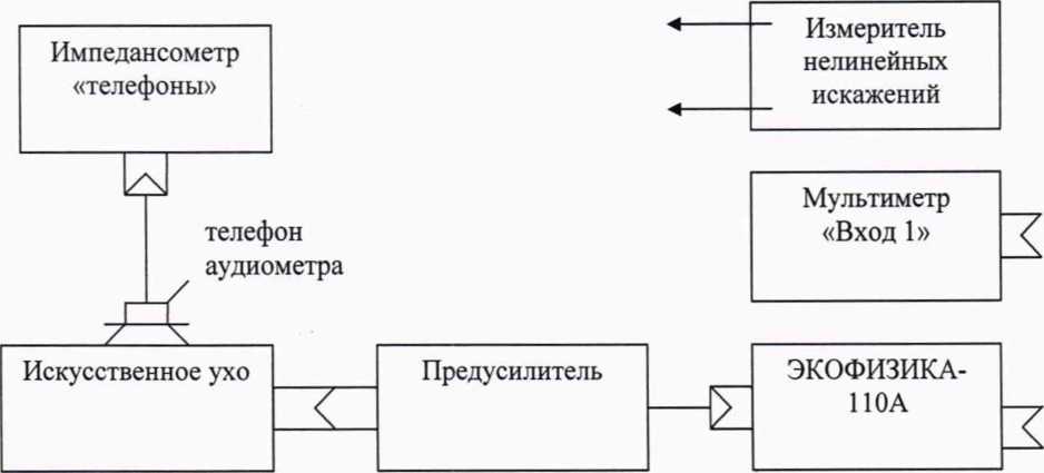 8.3.10.1 Собрать схему в соответствии со схемой рисунка 5 с использованием искусственного уха 4152 в комплекте с акустическим устройством связи, зонда, мультиметра в режиме «частотомер», подключаемого к ЭКОФИЗИКА-110А.