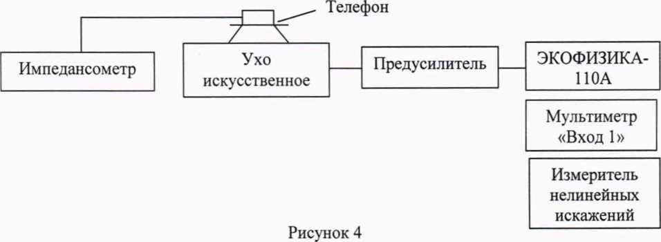 8.3.9.1 Собрать схему в соответствии с рисунком 4 с использованием искусственного уха 4152, телефона для контралатеральной стимуляции, мультиметра в режиме «частотомер», подключаемого к ЭКОФИЗИКА-110А.