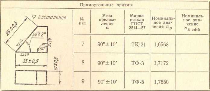 3. Материал призм — оптическое стекло марок ЛК-5, БК-6, Ф-1 и ТК-21 с номинальными значениями nD соответственно 1,4781; 1,5399; 1,6128 и 1,6568