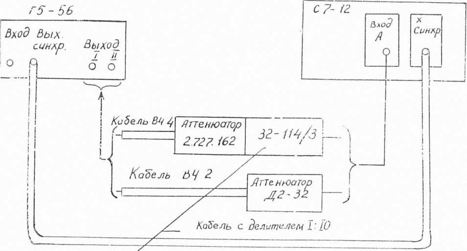 Синхронизация ocmi.vioi рафа <7 12 осуществляется основным импульсом I (II) капала с генератора Г5-56. На вход осциллографа через аттенюатор из комплекта ВИПа осциллографа C7-i2 подаются импульсы испытуемого 11 (1) канала обеих полярностей