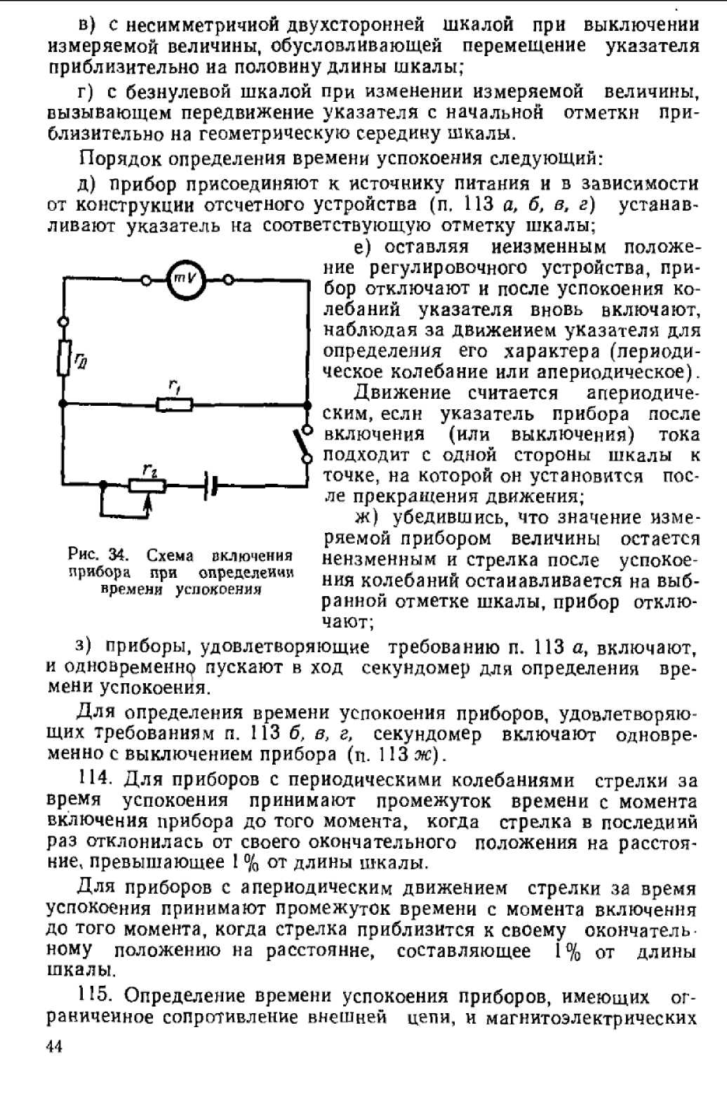 Время успокоения подвижной части приборов термоэлектрической, тепловой и электростатической систем, приборов с подвижной частью на подвесе и приборов с длиной стрелки более 150 мм ие должно превышать 6 сек, а для остальных приборов—4 сек. Для вольтметров электростатической системы, выпущенных по ГОСТ 1845—59 или ранее, с пределами измерения до 60 в время успокоения должно быть не более 10 сек.