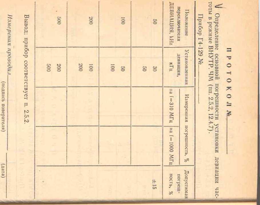 2.5.2. Девиация частоты устанавливается и отсчитывается в пределах от 30 до 500 кГц во всем диапазоне модулирующих и несущих частот. Номинальные значения шкал индикаторного прибора 500, 200, 100, 50 кГц.