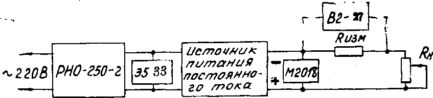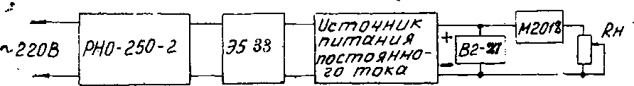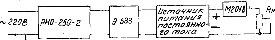 Рис. 8. Структурная схема измерения нестабильности выходного тока при изменении напряжения питающей сети ’в режиме стабилизации тока Rh — нагрузочный реостат