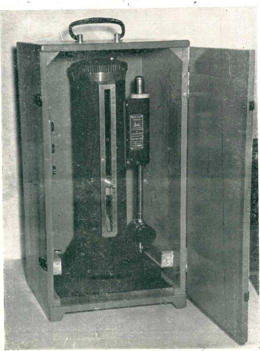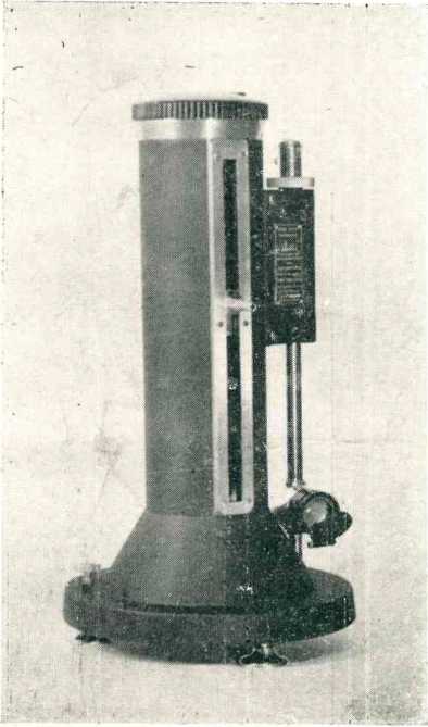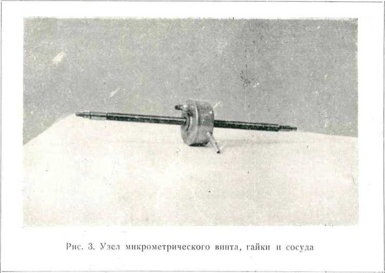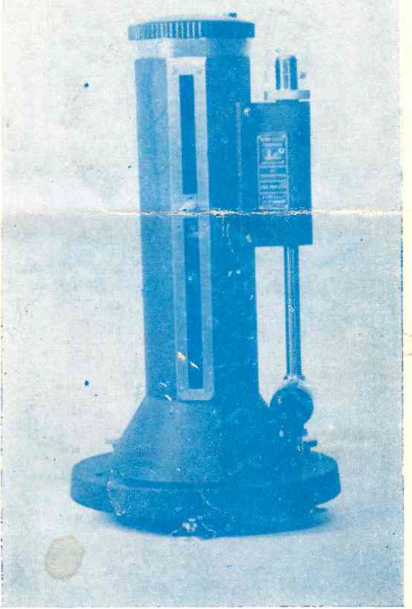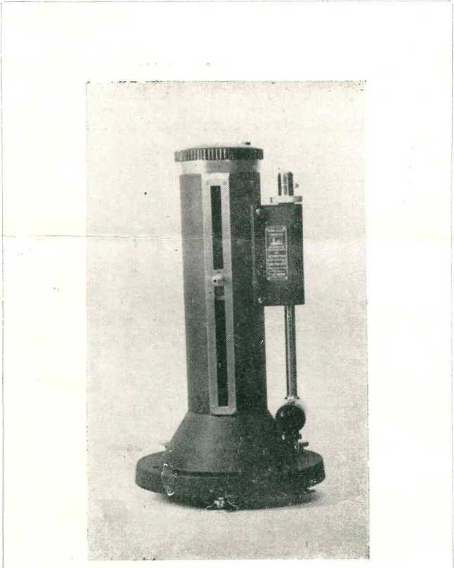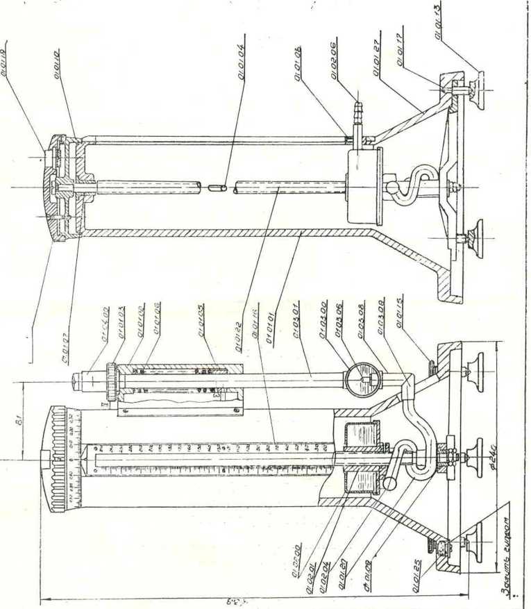 На нижнем конусе основания с левой стороны прибора вмонтирован шаровой уровень 01.01.25 для установки прибора в горизонтальном положении. Сосуд 01.02.00 имеет поступательное движение „вверх-вииз“, сообщаемое ему микрометрическим винтом 01.01.22 в пределах 0—250 мм.