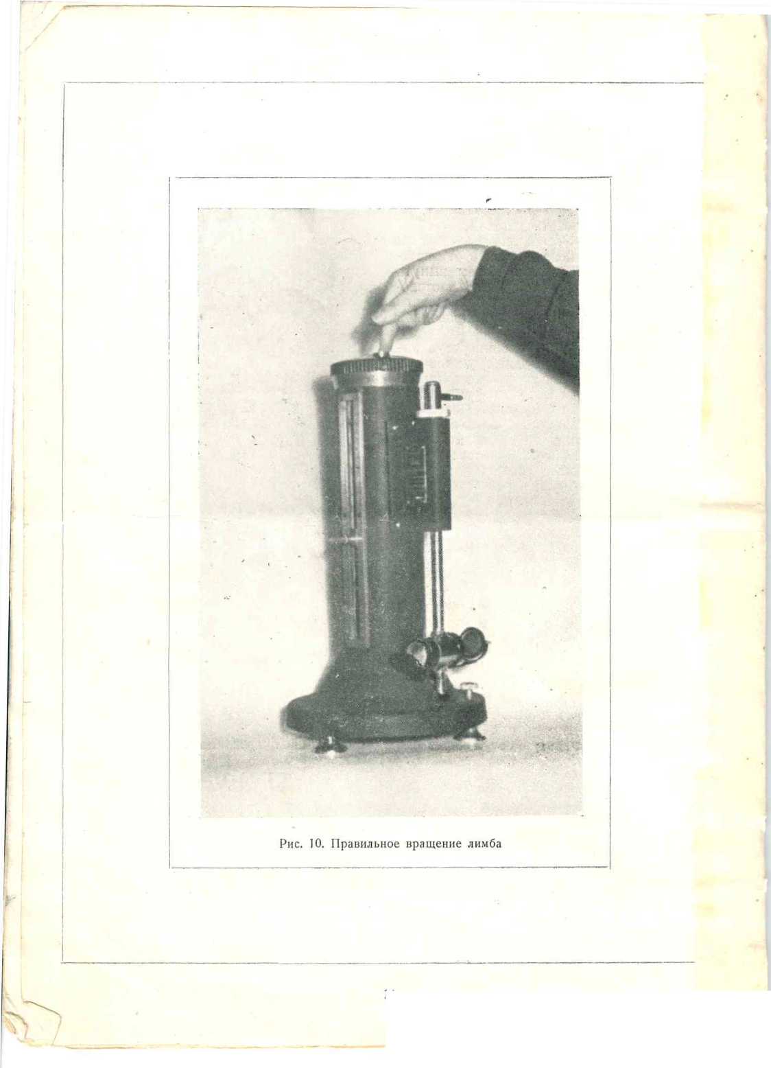 Далее поворотом лимба по часовой стрелке поднимают сосуд вверх (рис. 10). Вращение надо производить до тех пор, пока уровень воды в сосуде оптической системы не займет прежнего положения, т. е. пока между вершинами двух изображений штифта указателя установится первоначальный зазор.