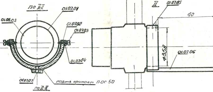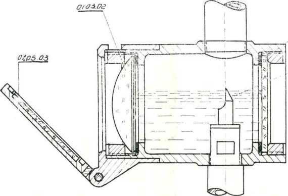 В кожух 01.01 02 вмонтирована трубка 01.03.01, на нижнем конце которой находится сосуд 01.03.00 оптической системы с золоченным штифтом-указателем 01.03.06. В нижнюю часть оптического сосуда впаян угольник 01.03.09. С торцов оптического сосуда монтируется: плоскопараллельное матовое (молочное) стекло 01.03.04 (рис. 4) с одной стороны, плосковыпуклая 7-микратная линза 01.03.02 с другой стороны и на откидной крышке плоскопараллельное зеркало 01.05.03.
