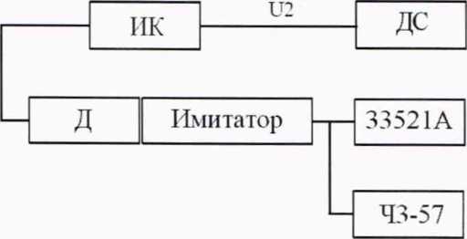 ДС - диагностическая станция (ДК или компьютер); ИК - измерительной канал аппаратной платформы; Имитатор - имитатор перемещений КОБМ.442269.002; 43-57 - частотомер 43-57;