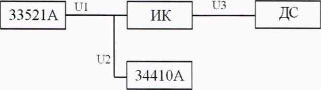 ДС - диагностическая станция (ДК или компьютер); ИК - измерительной канал аппаратной платформы; U1 ...U3 - технологические кабели ;