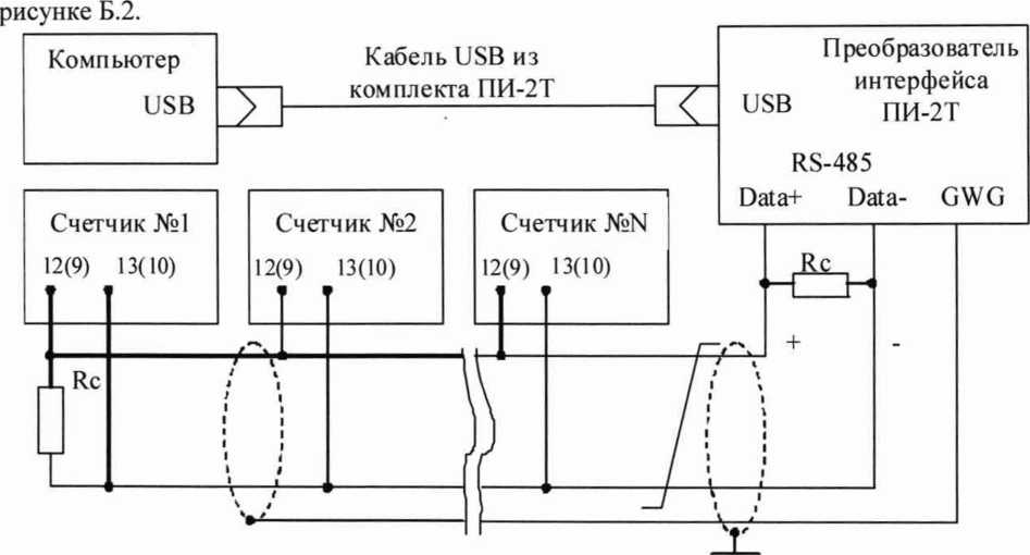 Б.1 Схема подключения счётчиков к компьютеру через интерфейс RS-485 приведена на рисунке Б.1. Схема подключения счётчика к компьютеру через оптопорт приведена на