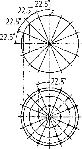 - восемь точек (равномерно расположенных) на 90° ниже вершины, т.е. на диаметре и повернутых относительно предыдущей группы на 22,5°.