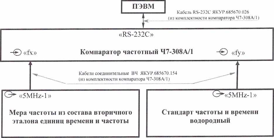 8.3.3 Определение нестабильности частоты выходных сигналов 5 МГц провести путем определения относительного среднего квадратического двухвыборочного отклонения (СКДО) частоты за интервалы времени измерений 1 с; 10 с; 100 с; 1 ч и 1 сутки с помощью компаратора частотного 47-308А/1 и стандарта частоты и времени водородного, из состава вторичного эталона единиц времени и частоты ВЭ-31-97. Измерения проводят по схеме, приведенной на рисунке 1. по истечении времени установления рабочего режима, указанного в п.4.2.17 руководства по эксплуатации ЯКУР.411141.038РЭ.