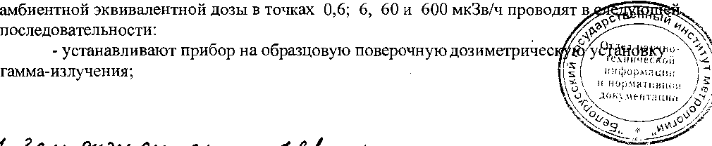 - снимают требуемое количество отсчетов показаний прибора, нажимая кнопку ПУСК после каждого отсчета, и находят их среднее арифметическое значение. При этом количество отсчетов показаний в точке 0,6 мкЗв/ч равно 10, в точке 6 мкЗв/ч — 5, в точке 60 мкЗв/ч - 3, в точке 600 мкЗв/ч - 1;