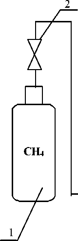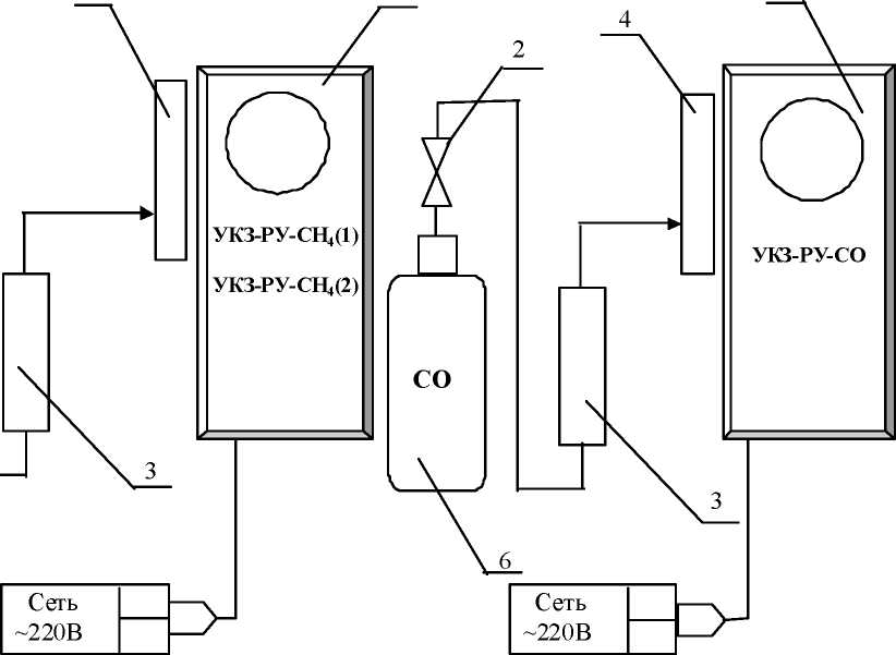 6.3.1.1. Собрать схему измерений, представленную на рисунке 1. Определение абсолютной погрешности срабатывания устройства УКЗ-РУ-СН4(1) проводят при поочередной подаче на устройство ПГС № 1 - №2 (Приложение 1) с расходом 30 40 л/ч.