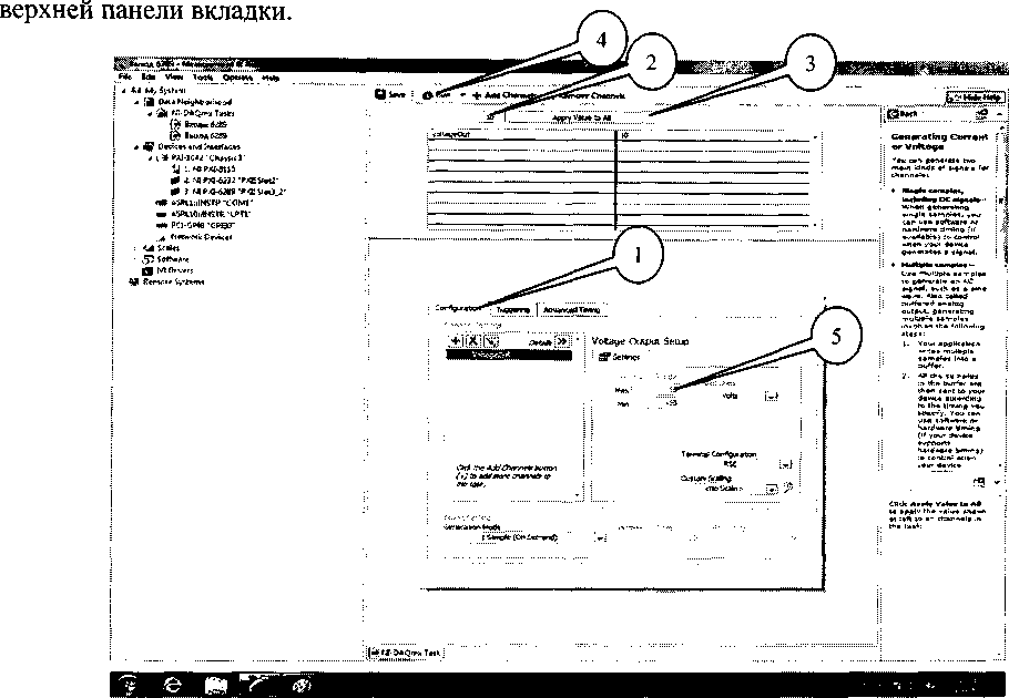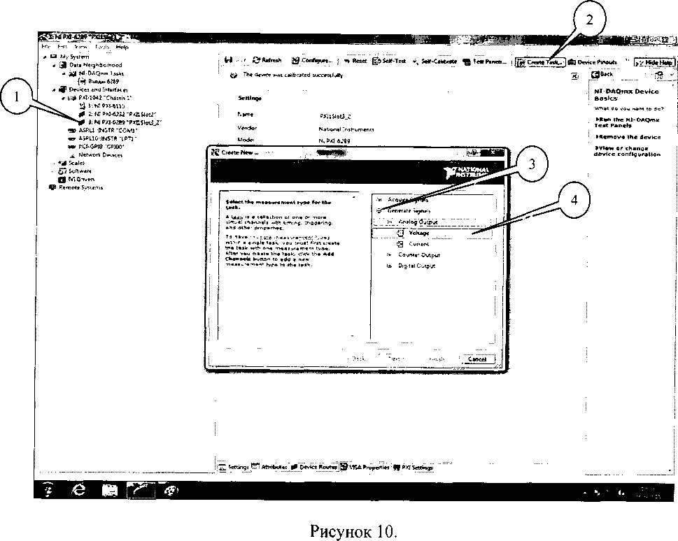 7.4.1 В диалоговом окне программы «Measurement & Automation Explorer» (рисунок 10) выбрать поверяемый модуль (1), нажать кнопку «Create Task» (2). В появившемся окне раскрыть меню «Generate Signals» (3), далее раскрыть меню «Analog Output» и в нем выбрать измеряемую величину «Voltage» (4).