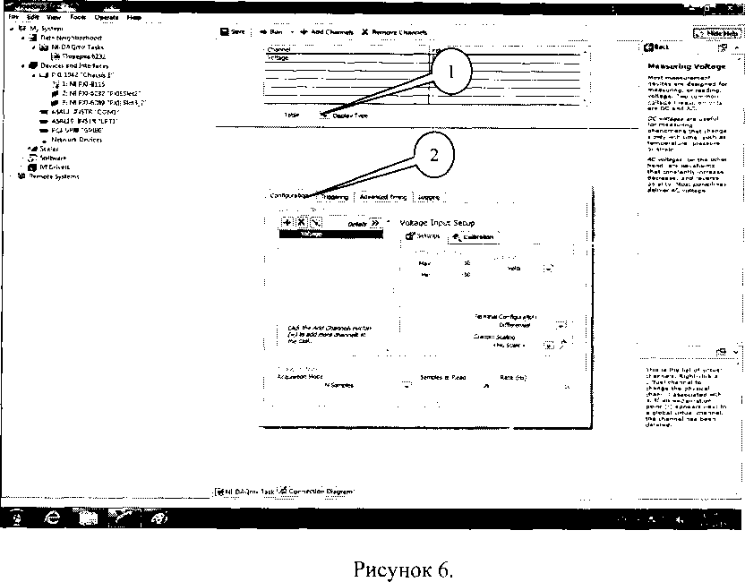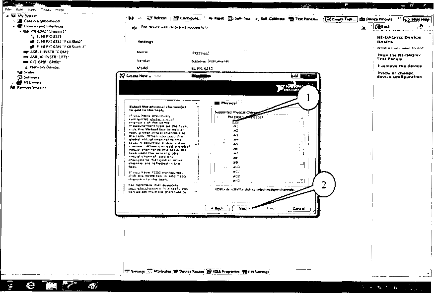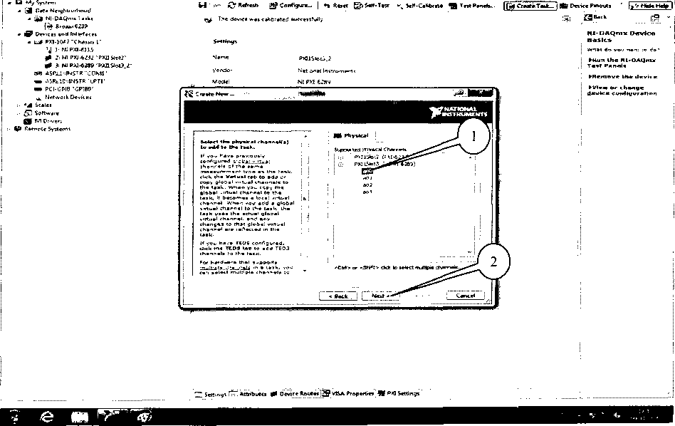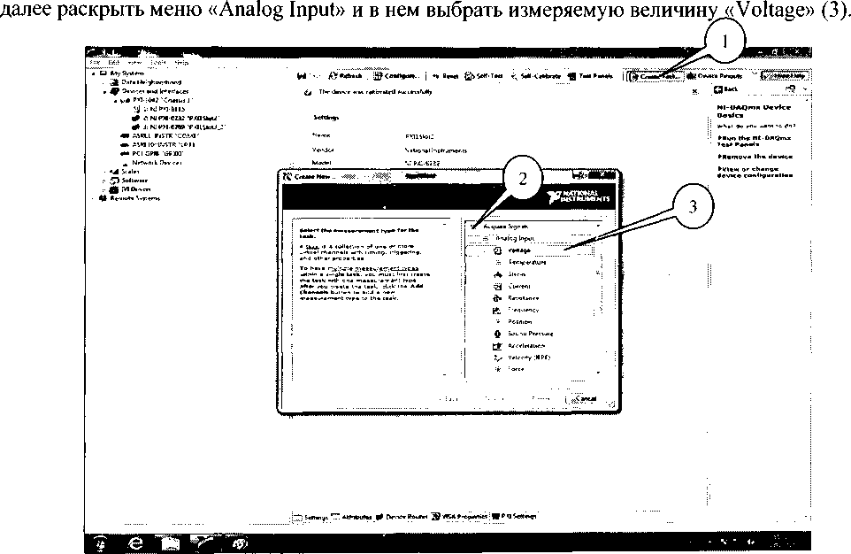 7.3.1 В диалоговом окне программы «Measurement & Automation Explorer» (рисунок 3) нажать кнопку «Create Task» (1). В появившемся окне раскрыть меню «Acquire Signals» (2),