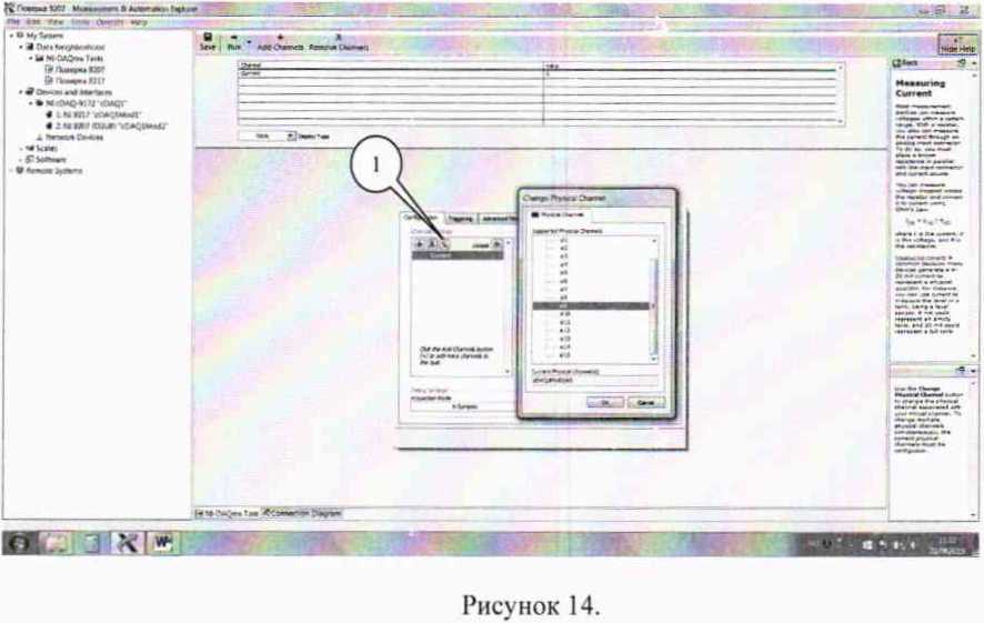 7.3.7 Выполнить операции по п.п. 7.3.4 - 7.3.6 для каждого из каналов модуля. Для переключения каналов (рисунок 9) нажать кнопку (1), выбрать требуемый канал и нажать кнопку «ОК». Для модуля N1 6289 при поверке каналов «ail6» - «ai31» терминальный блок подключить к разъему 2.