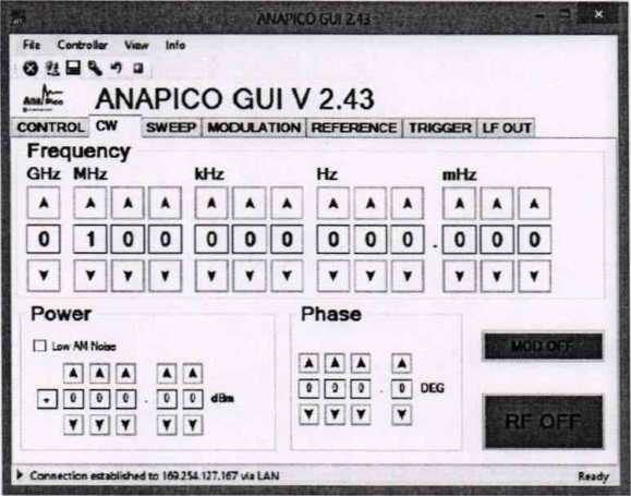 10.7.6 В программе управления генератором включить синхронизацию от внешнего опорного генератора частотой 10 МГц.