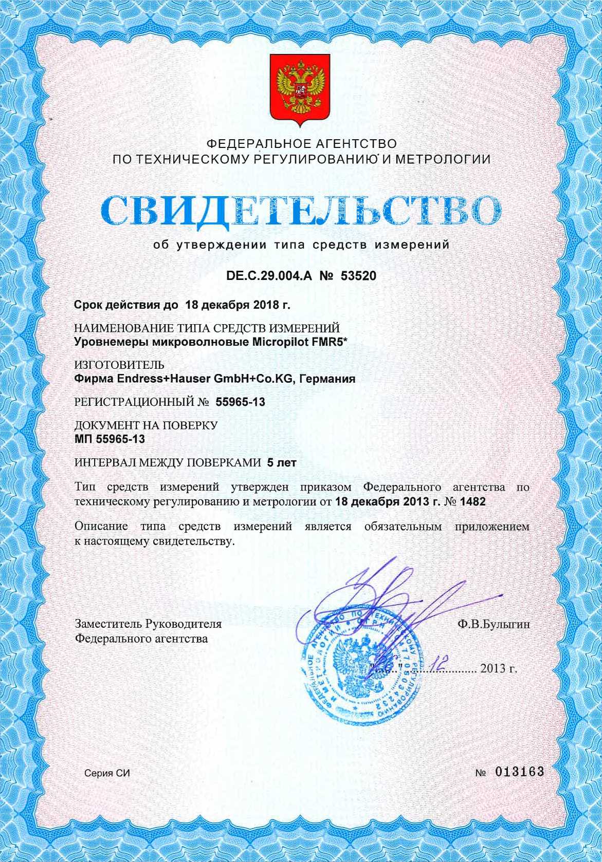 Описание типа «Уровнемеры микроволновые Micropilot FMR5* Фирма Endress+Hauser GmbH+Co.KG, Германия» (DE.C.29.004.A № 53520)