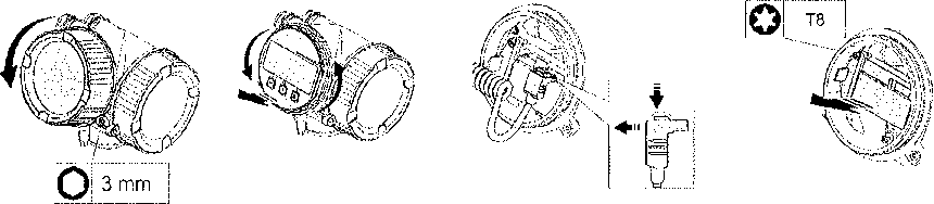 Вынимают измерительный преобразователь уровнемера из корпуса согласно указаниям, приведенным в руководстве по эксплуатации и рис. 4. Вставляют измерительный преобразователь в корпус вспомогательного уровнемера того же исполнения.
