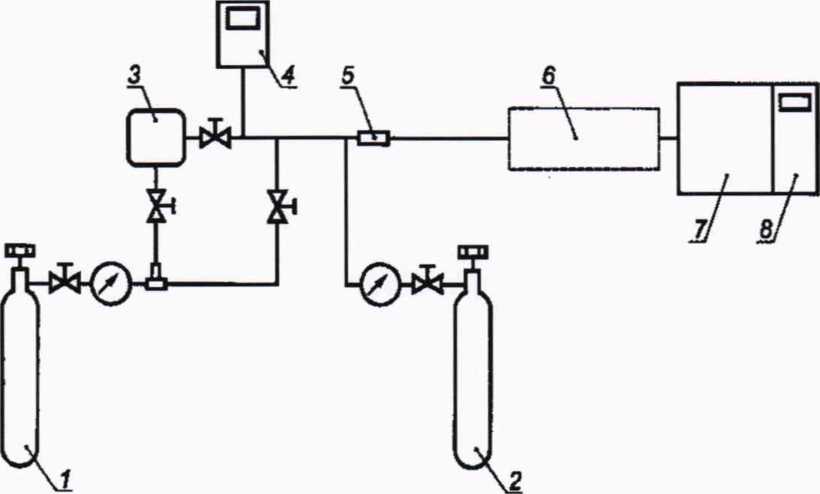 1 - баллон с газом-носителем (азот, воздух); 2 - баллон с газовой смесью ГСО-ПГС; 3 - генератор влажного газа; 4 - анализатор содержания паров воды; 5, 6 - система пробоотбора; 7 - блок газоаналитических ИК системы; 8 - блок технических средств для обработки, хранения, визуализации и передачи данных
