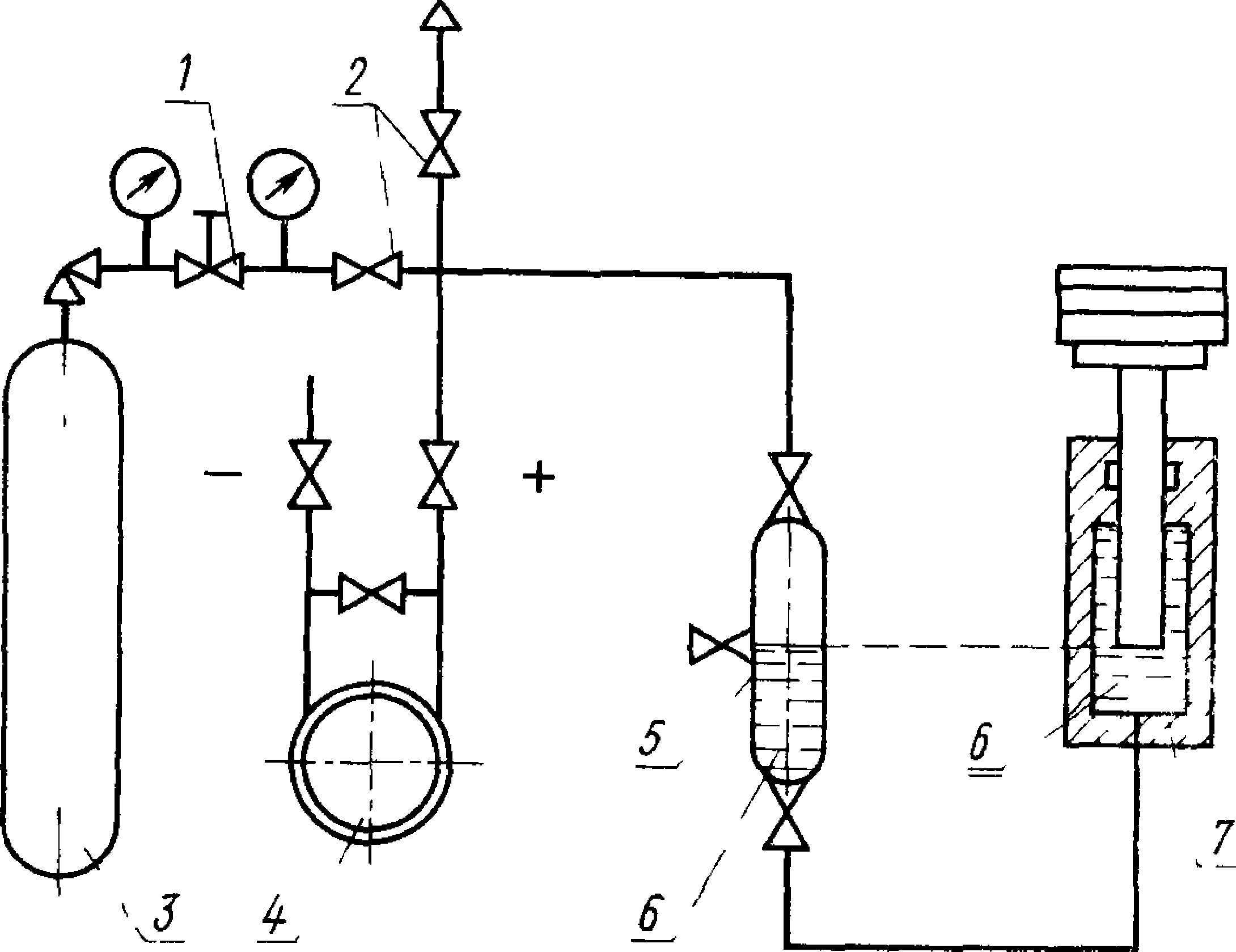 1—редуктор; 2—запорный вентиль; 3—баллон со сжатым азотом, 4—по веряемый преобразователь; 5—разделительный сосуд; 6—рабочая жидкость; 7—грузопоршневой манометр