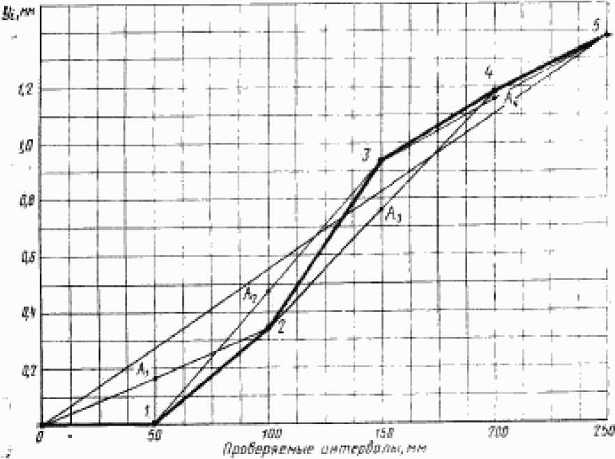 В общем случае при построения крнвпй профиля бруска положительные значения At &ГКД1ДЫВЭВОТ ян на от тоответств^юшкх точек, л отрицательные — ЬМ₽Ол1кделнв |юловяппе точек профиля, соединяют ня ломаной линией. Через крайкн? точки (?и5 проводят пряную л определяют отклонения И t птчгк про Лили от прямой fl—5. Огклоиеяня отсчитымиг вдмь осн ординат, ыл к точке 5™ожг.£ выше прямой У-5, отнловекнг з^ншаают <п янанич <пл^> если нижа—со знзкди яиииуе». Кеи следует из чпргежа, rfD-Uh т=—0.2а ыкм. 0 21 мим; Jf3-0,11 инн1 ккм; ^“-<1 мкм.
