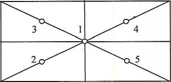 Грузоприёмную платформу весов нагружают гирей или гирями (не более 2-х гирь), масса которых максимально близка к 1/3 НПВ весов. Гири размещают в центре платформы, а затем поочередно в одно из положений, как показано на рисунке ниже, гири не должны выходить за пределы платформы: