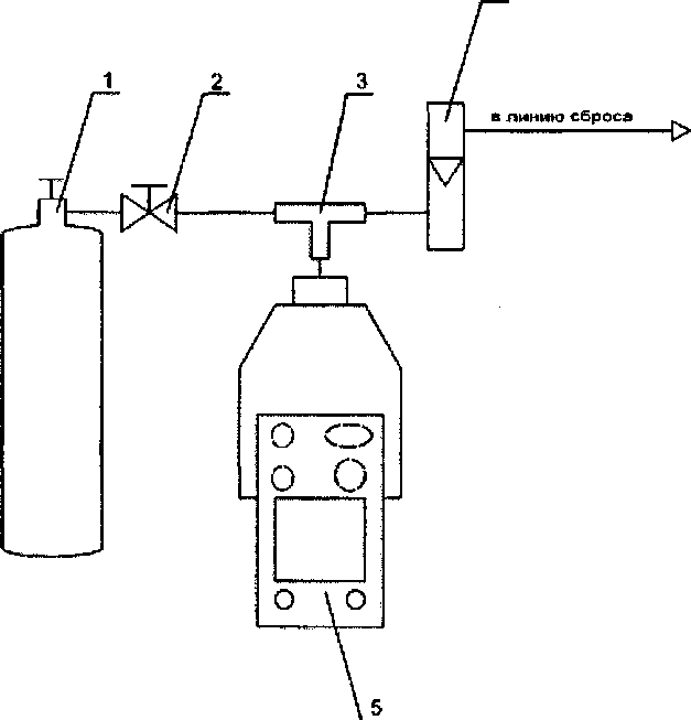 Примечание - для газоанализаторов в исполнении для диффузионного отбора ГС подавать напрямую, с расходом 0,5 ± 0,1 дм3/мин, для газоанализаторов в исполнении для принудительного отбора через тройник, при этом расход ПГС установить таким образом, чтобы показания ротаметра 4 были в диапазоне от 50 до 150 см3/мин;
