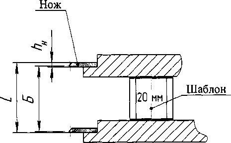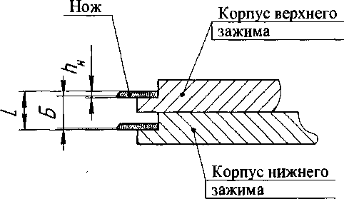 - измерить штангенциркулем в нескольких точках толщину верхнего hm и нижнего hHH ножей в рабочей зоне и из полученных значений вычислить среднее арифметическое значение толщины верхнего heH и нижнего hHH ножей;
