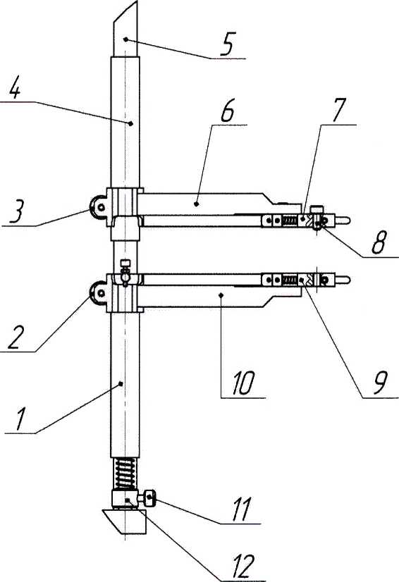 1 - втулка; 2 - винт; 3 - винт; 4 - втулка; 5 - направляющая, 6 - верхняя каретка; 7 - верхний зажим; 8 - опорный винт с шариком; 9 - нижний зажим; 10 - нижняя каретка; И - винт; 12 -втулка.