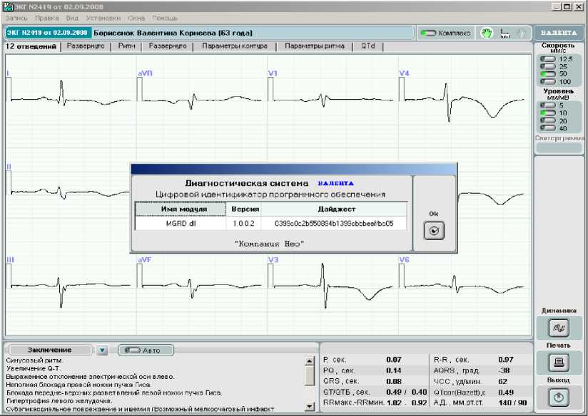 В состав программного обеспечения входит программа «Валента» и программа «Тест». Программное обеспечение (далее по тексту - ПО) предназначено для анализа зарегистрированных сигналов, документирования результатов исследований и ведения единой базы пациентов.