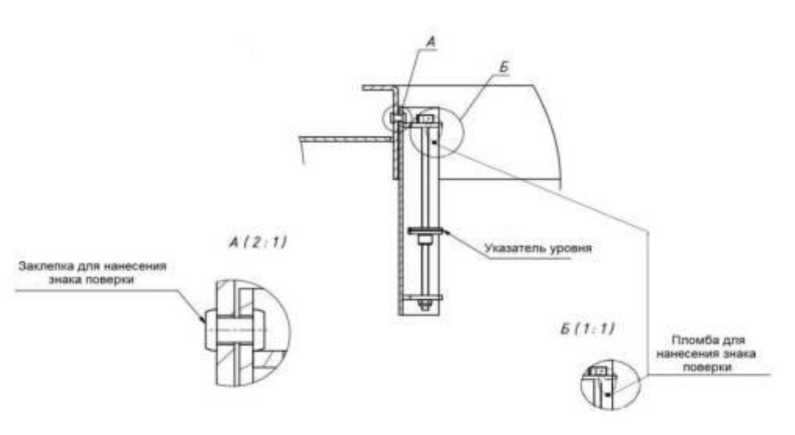 Схема пломбировки для защиты от несанкционированного изменения положения указателя уровня налива, обозначение места нанесения знака поверки представлены на рисунках 6-9. Знак поверки наносится ударным способом на заклепку, крепящую указатель уровня налива.