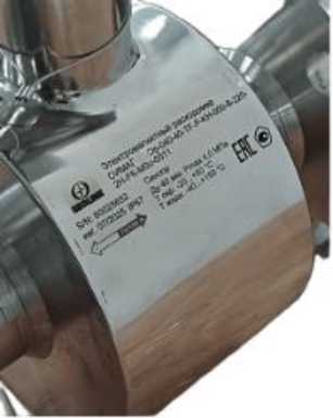 наносится типографским способом на маркировочную этикетку, закрепляемую на верхней стороне электронного блока и на сенсоре, либо непосредственно на корпус электронного блока и сенсора методом лазерной гравировки как показано на рисунках 5, 6, а также на титульные листы руководства по эксплуатации и паспорта расходомера.